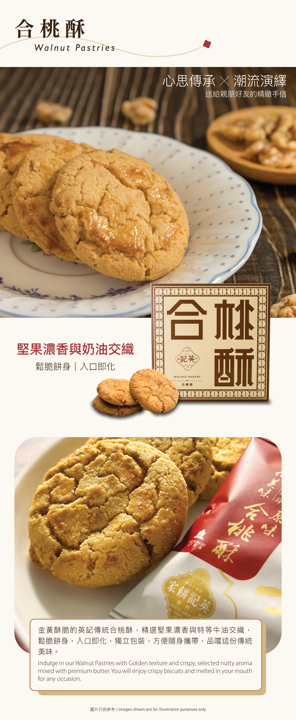 金黃酥脆的英記傳統合桃酥,精選堅果與牛油,鬆脆餅身,入口即化,獨立包裝,時時都品嚐到這份傳統滋味。