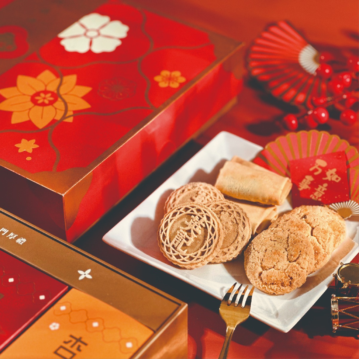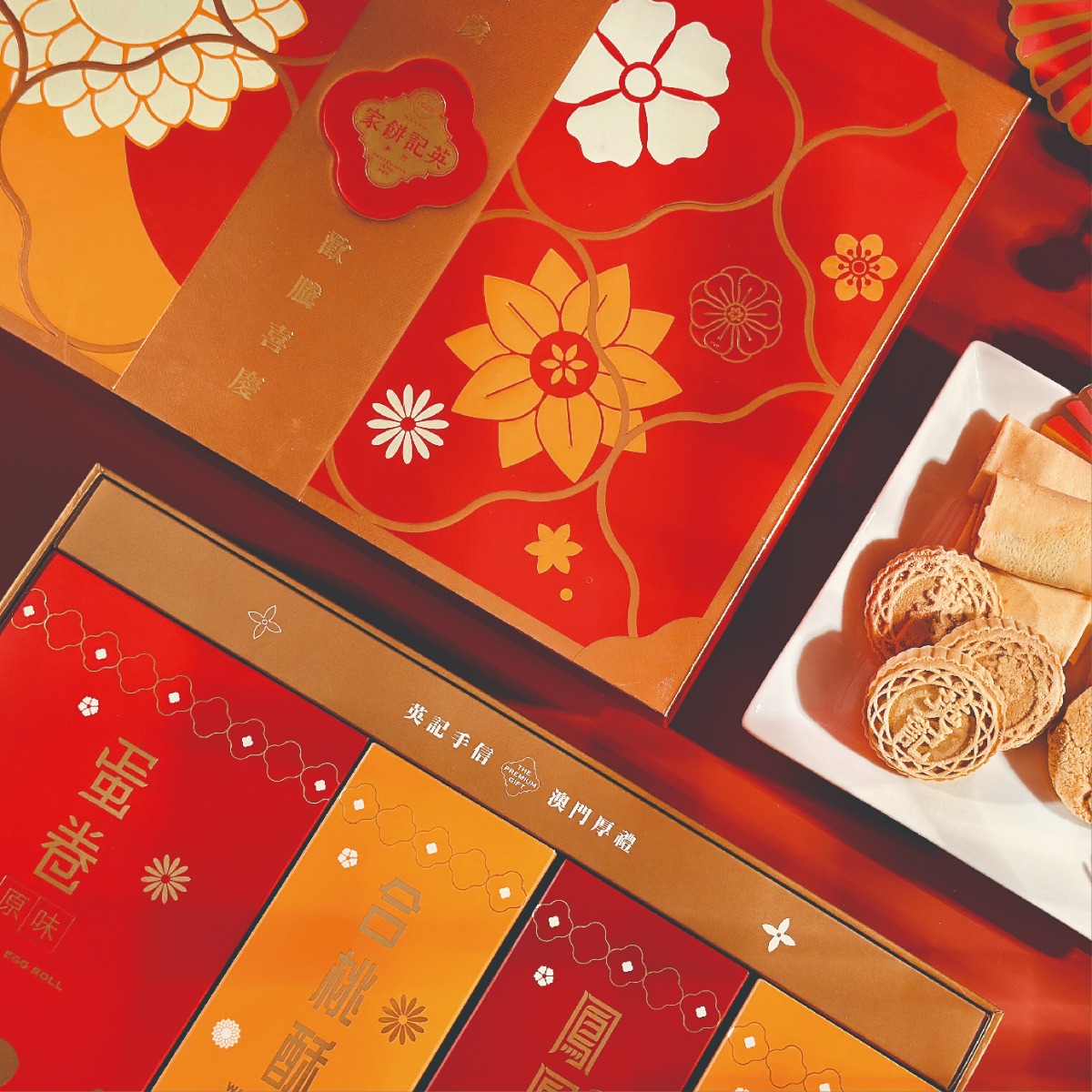 四喜獻禮禮盒內有五款英記傳統中式餅食,包括原味杏仁餅,蛋黃杏仁餅、原味雞蛋卷、鳳凰卷及合桃酥,禮盒設計採用精美的傳統花紋圖案,盒內糕餅以獨特華麗的禮盒包裝,心思獨到。傳統糕餅用料上乘,嚴選進口原材料匠心製作,最適合送禮及與親友一同分享。