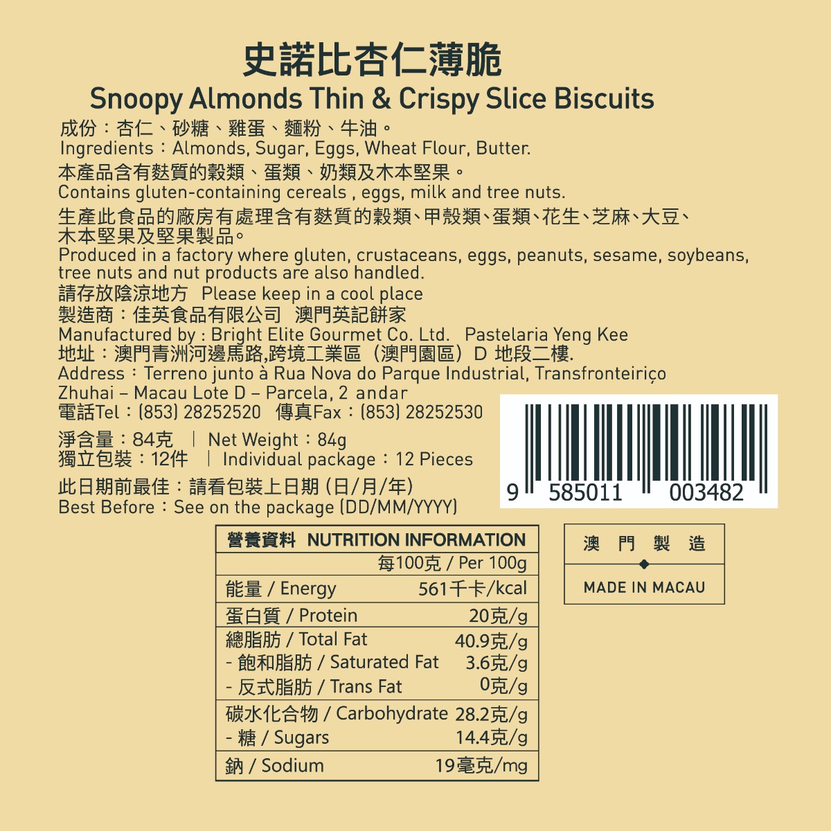 史諾比加上精緻的杏仁薄脆來了!可愛的史諾比盒內裝有香脆濃香的杏仁薄脆,金黃色的酥脆糕餅上,加入嚴選的進口杏仁!一股溫暖醇厚的堅果香氣直達味蕾,香脆糕餅加上醇香的堅果香味,留下一絲絲令人回味的餘韻!