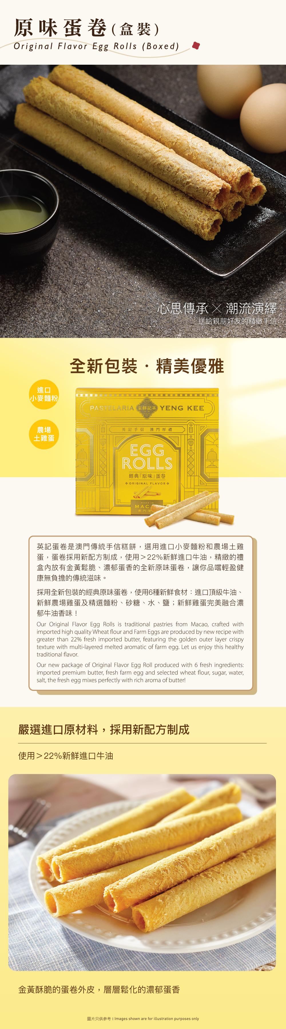 採用全新包裝的經典原味蛋卷,使用6種新鮮食材:進口頂級牛油、新鮮農場雞蛋及精選麵粉、砂糖、水、鹽;新鮮雞蛋完美融合濃郁牛油香味!
