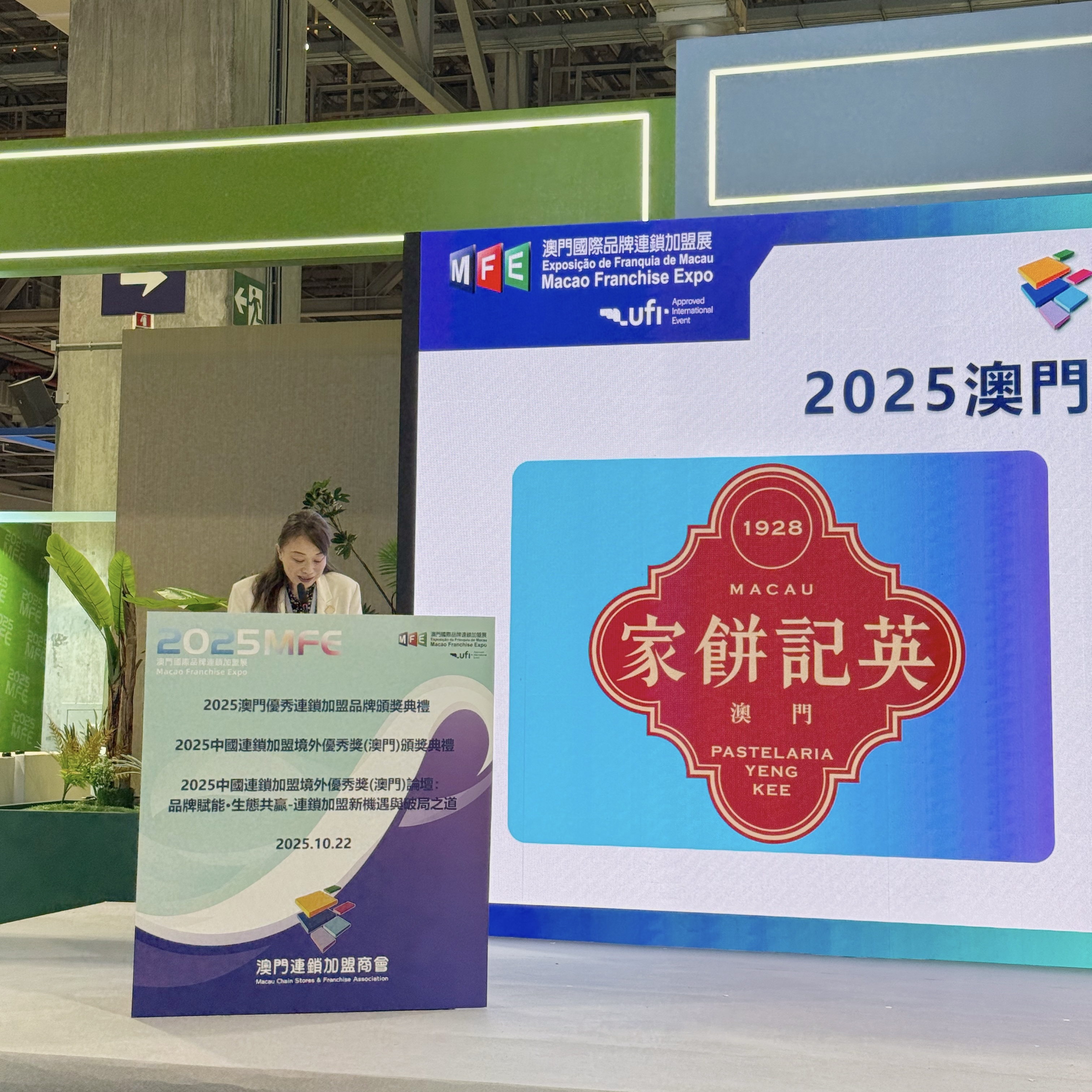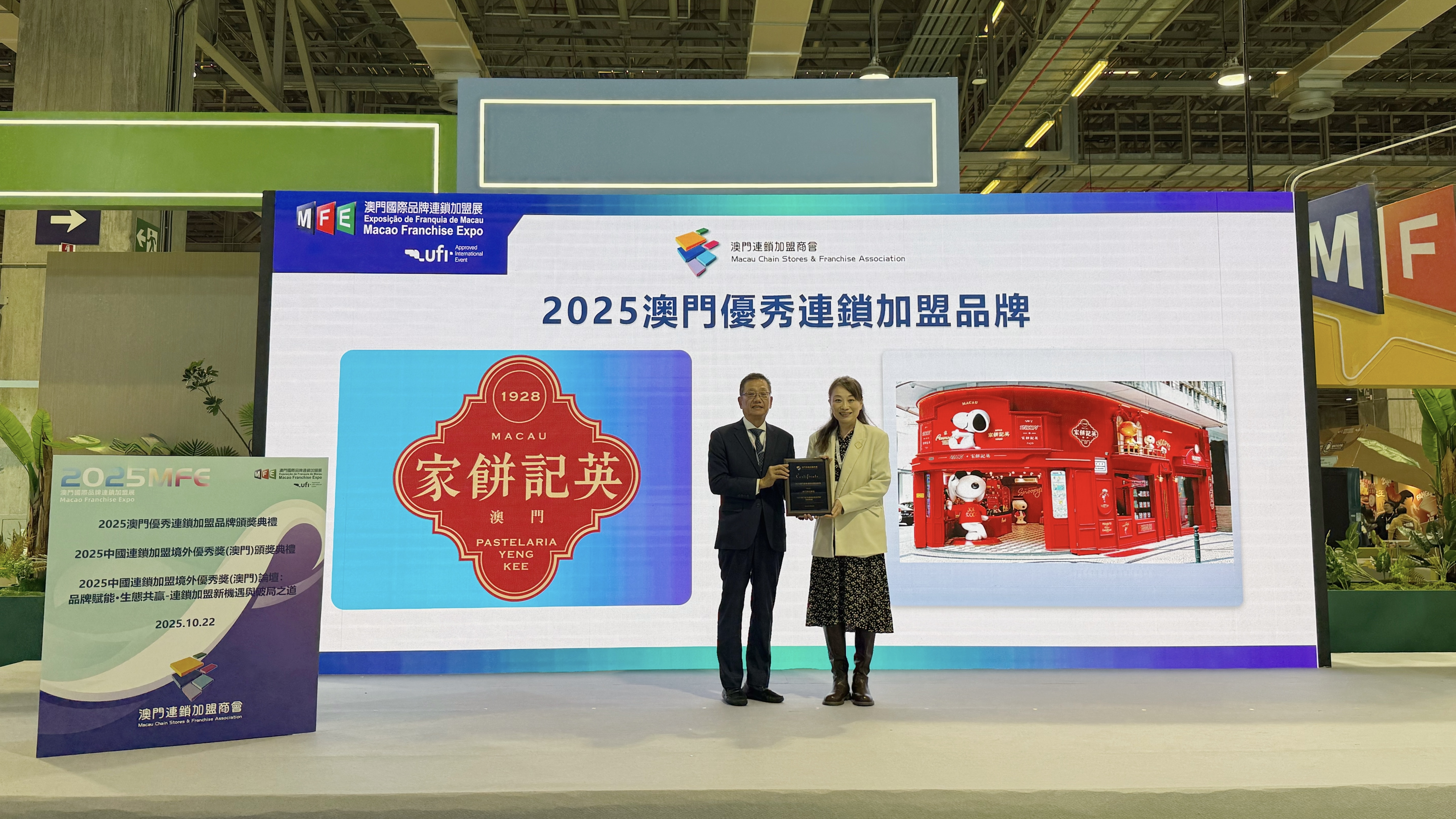 澳門英記餅家榮獲2025年度澳門連鎖加盟商會頒發的「澳門優秀連鎖加盟品牌」殊榮。
